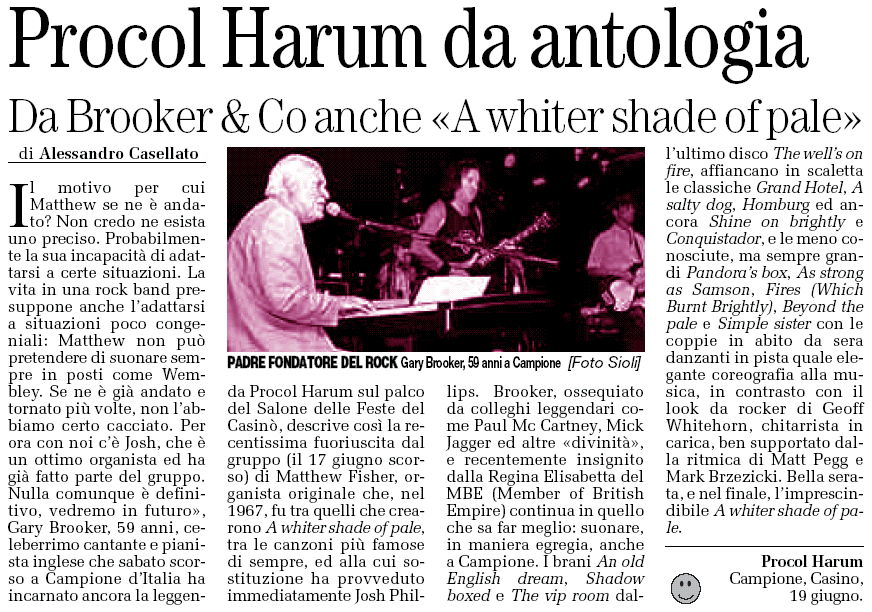 That’s how Gary Brooker, 59, the extremely famous English singer and pianist who brought Procol Harum on stage at Campione’s Salone delle Feste del Casinò last Saturday, describes the most recent exit (on 17 of June last year) of Matthew Fisher, the original organist who in 1967 was one of the creators of A Whiter Shade of Pale, among the most famous songs of all time and who has immediately been replaced by Josh Phillips.
