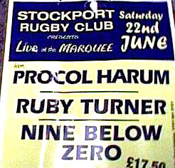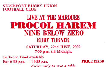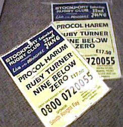 Here's the Procol text from the souvenir programme. It's evidently digested from many sources – some will be familiar to people who frequent this website – and it undoubtedly serves to give some needful background information to the non-Paler who might have come to the Marquee: but it contains numerous mistakes or misunderstandings, and even the discography (a good idea!) has some notable omissions. The spelling on the tickets and posters was in similar need of spell-checking (but see the foot of the page) ... and the backstage passes – though they spelt 'Procol' and 'Harum' correctly – managed to get the year wrong!