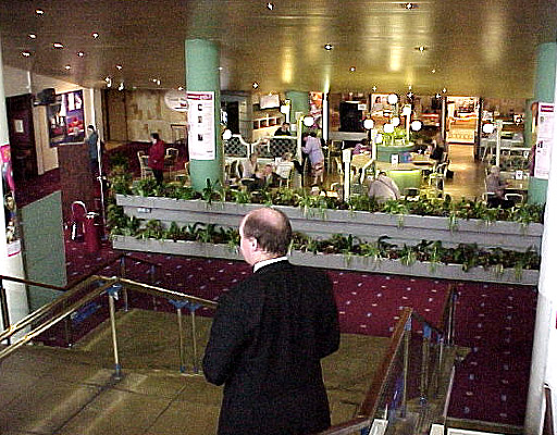 It also houses a nice café (see right) and a public bar and good restaurant. Palers will have no need to leave the building between 3 pm (start of Palers' Fair) and 1 am (end of Champagne Reception): any gaps can be filled by eating and drinking in situ. Here the very helpful Catering Manager, Gary B, surveys his domain. |