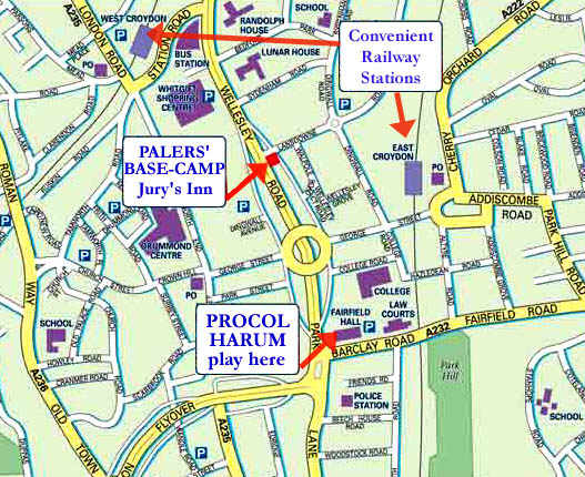 The Palers' Fair and 'One More Toast' will both take place on 25 May at the Fairfield Halls, the same building where Procol Harum are playing in the evening. To get from basecamp at Jury's to the Fairfield Halls, walk south down the main road – past Croydon College – for exactly five minutes. Should it happen to be raining you could use the city's tram network. Palers who visited Manchester last year may get the idea that all British cities have tram systems. Sadly, this ain't so. |
