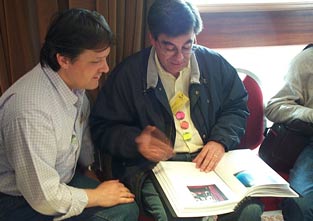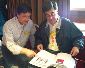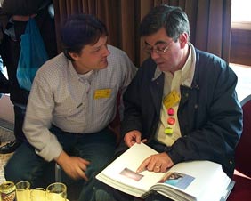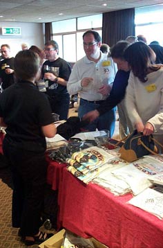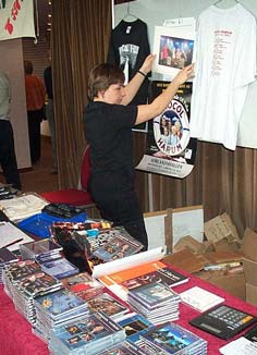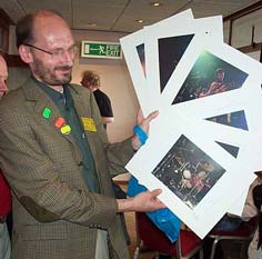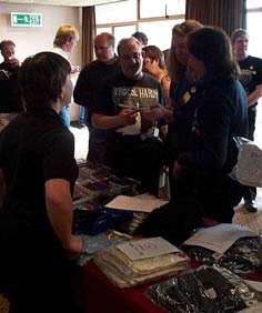 Trade was brisk in Procol Harum CDs, DVDs and teeshirts, and solo spin-off project CDs as well. There were Palers' Band recordings and BtP commemorative Croydon shirts ... and further to the right (though not pictured) Chris Groom was exhibiting 'Local Procol' Croydon pictures and selling his book at a generous discount. Visit the BtP shop and the Shine On merchandise page to acquire these items now. |