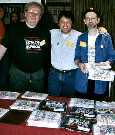 This illustration shows Martin Awsop, from Spain, with Jens and Roland who run 'Beyond the Pale' and the stall where the last few limited-edition 'One More Toast' tee-shirts are set out awaiting the people who pre-ordered them. In the background, fans may be seen at the bar. |