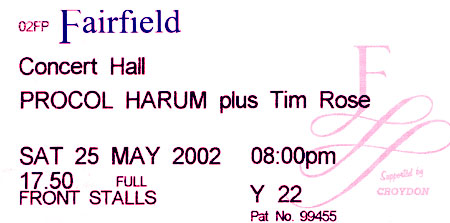 Notable points: no Conquistador, Shine on Brightly, A Salty Dog, Grand Hotel; two highly unexpected 'tangential items': the Brooker/Reid Harlequin, originally recorded by the Hollies, and Matthew Fisher's Separation (probably given its live première last year by The Palers' Band); one entirely new Procol Harum song, Ten Thousand Souls. Imagine was evidently unpremeditated, but we got a full verse and (after a hilarious hiatus) a full chorus too. |
