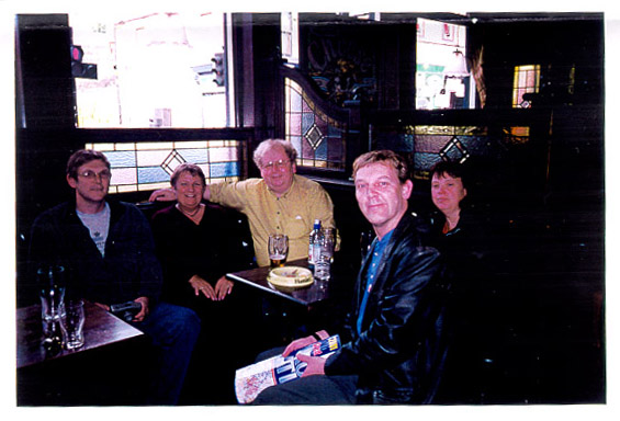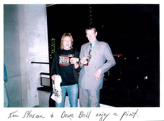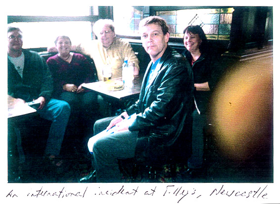 Ken Stasion's pictures begin in Newcastle, where May 24th's Procol gig was cancelled … we nonetheless see smiles on the faces of Scandinavian Palers Thomas Raa Olsen, Titti Ravnaas, Jens Anders Ravnaas, Morten Raa Olsen and Karen Raa Olsen; the last in this series was taken the following night in Croydon … two guitarists enjoying a drink on the balcony at the BtP's 'One More Toast' celebration |