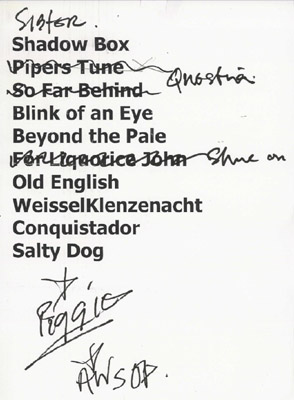 Thanks to One-Eye for the setlist scans, on which a player's hand (Matthew Fisher's?) has scribbled the evening's amendments to the standard setlist with its non-standard spelling of Homburg which we have seen at most gigs in 2003 ... Samson likewise |