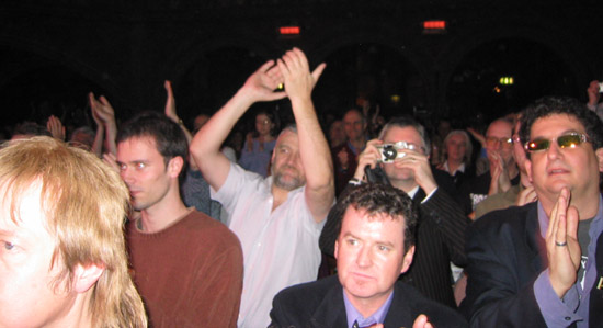 Let me just pause for a moment. All night the Band looked happy and were on top form. There seemed to be an end-of-tour party spirit and I thought they really gelled, playing with less reserve than seen on the Copenhagen DVD. Matthew was smiling and at his most animated – my new pal Mike Masterton (a London-based Scot) had positioned himself stage-right best to see his hero and thought Matthew was the bee's-knees tonight. Mark was superb and inventive – never 'playing safe' in the slightest. Matt had acquired a jaunty Tyrolean hat (we were half-expecting yodelling instead of backing vocals!) and gave out a solid and inventive bottom-end. Geoff was that wonderful, lovable guitar genius and perfect showman, especially to his many Paler friends in the "front stalls". Meanwhile the newly-anointed Gary sang and played piano as well as he ever has, and possibly ever will.
