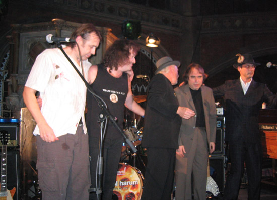 However there was a suitably austere and smoky ambience. We noted a few Procol artefacts, clues perhaps to the chosen repertoire for the evening? A foot-high George Bush figure, a white mouse (or rat) with a long tail on the piano, some Christmas figures and a fat old Buddha – at least that one was easy to figure out. Above the drums was the pulpit and high above that a massive, floodlit rose window. There were also half a dozen cameras, fed to a waiting OB scanner-van parked outside – this concert was to be videoed for a future a DVD release – and more crew than usual were scurrying around making the necessary adjustments to lighting and sound. It was difficult to count the crowd, but maybe 600–700 were downstairs or aloft in the gallery as the Band took the stage at eight.