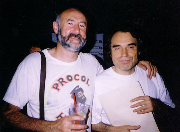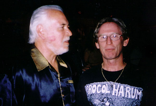 George and Matthew Fisher ... we think that Matthew is holding an envelope containing his copy of George's 'Procol Pilgrimage' essay, which the band greatly enjoyed, and which you can read here |