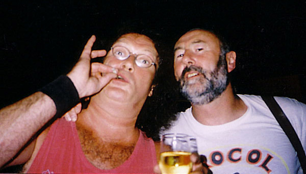 Mike Pacey's caption for this picture of Geoff and George reads, 'George and a friend, who is enjoying a brief reality hiatus'. Geoff actually enjoyed a similar hiatus on stage at the Fillmore a couple of days later! |