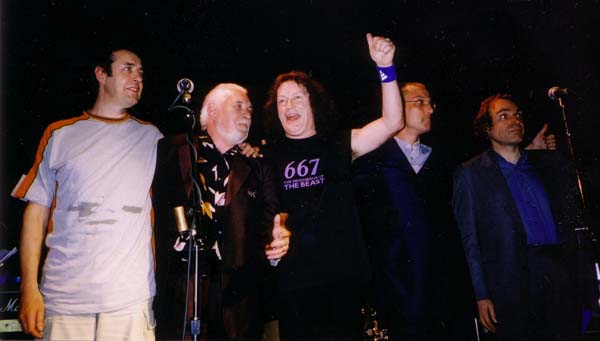 The Commander rolled on. A speaking toy doll, identified as Eminem, with Gary’s assistance playfully introduced So Far Behind. The mood turned solemn and somber in The Blink of an Eye, Keith’s meditation on the events surrounding 11 September 2001. "Pillars of dust blocked out the sun, all that the people could do was run." A reflective pause led to Beyond the Pale, delivered with thanks to Webmasters Jens and Roland, followed by (for me at any rate) a rare rendition of the sad and haunting For Liquorice John. Keith’s adaptation of WH Auden’s Refugee Blues, the poignant An Old English Dream, set things up nicely for Weisselklenzenacht, a Fisher instrumental (Opus 2 according to Gary) in the monumental mode of Repent Walpurgis, his legendary Opus 1. The crowd went wild, which I understand was a common reaction when the piece was played during the European tour earlier in the year. Matthew’s signature Hammond delivery in turn paved the way for a rousing version of Conquistador, which shook Salvador to his animated Mexican roots.