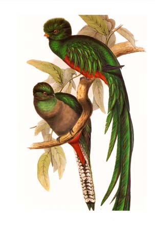 The card I’d written up in Montreal, welcoming the band to North America, was actually from Central America, and had an image of two resplendent quetzals, beautiful tropical specimens that are the national emblem of Guatemala.