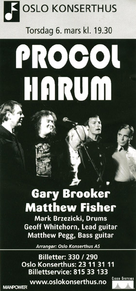 Very nearly half the show devoted to the new album: setlist very similar to the previous gig. PH went down a storm from the very first note of VIP Room, new material accepted alongside the classics, and never-ending applause for Weisselklnzenacht! Also heard, at soundcheck, a new Procol song, War is Not Healthy. |