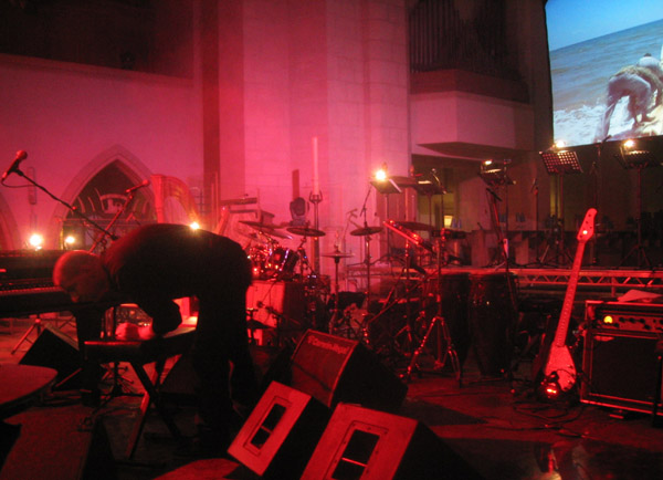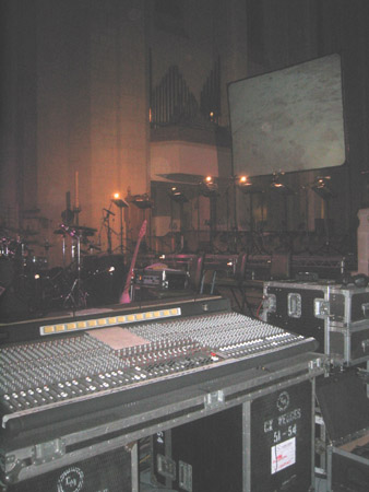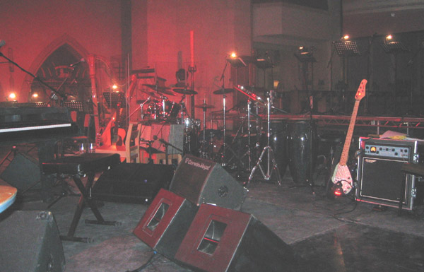 In the centre, Gary's favourite floor monitor; to the right, Matt Pegg's bass and head. The two percussion kits also visible.