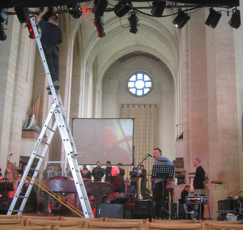 The full 'stage picture'; the lighting bar forms a kind of Rood Screen; the video screen takes the place of the centre of an altar triptych. Note the PA stacks in front of each pillar.