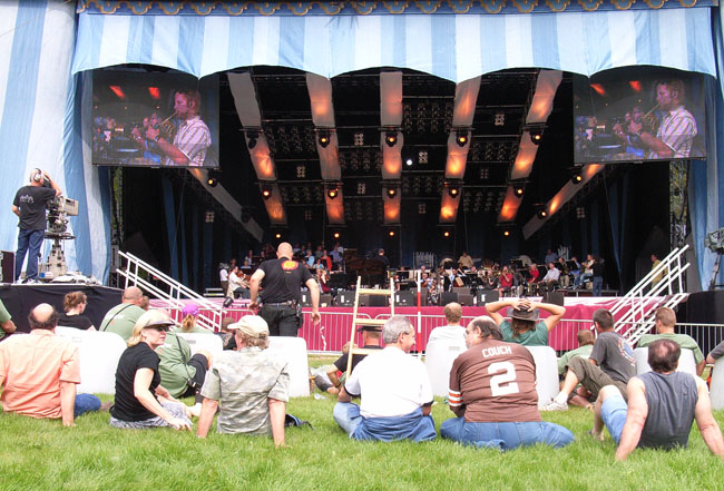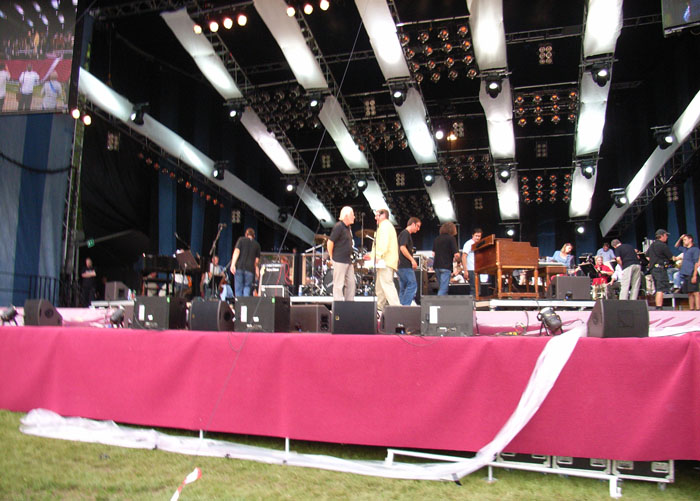 The band milling about onstage; note the straggling decoration front of stage: by the following day all this would be fixed