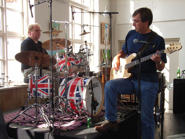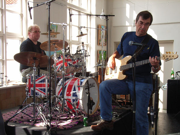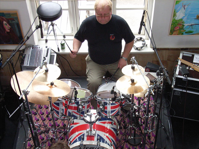 Aerial close-up of the British-influenced drumkit (and associated mixer), with BtP Webmaster Jens Anders Ravnaas at the helm