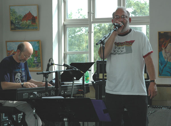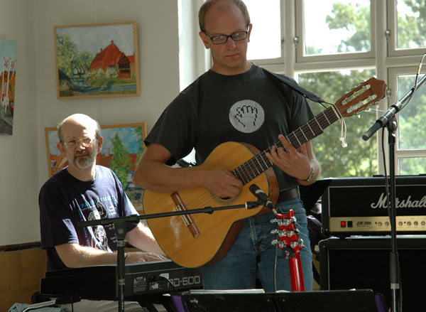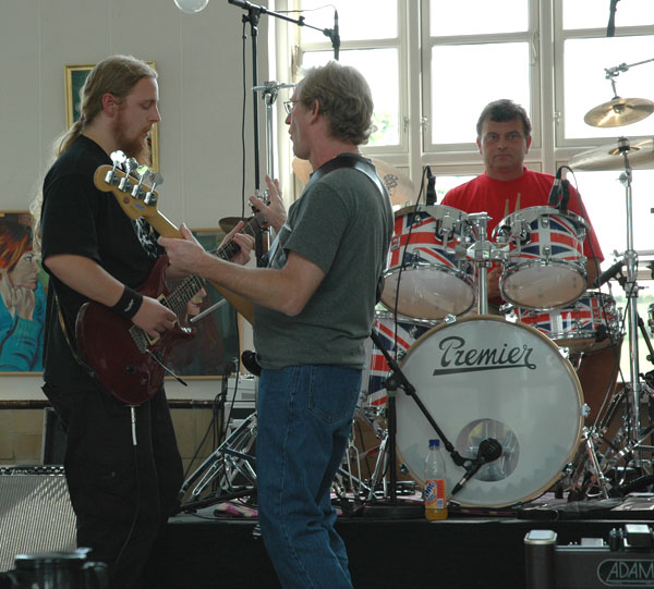 This looks like a guitar lesson ... but who's teaching whom? Andrè waits at the drums