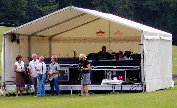 In front of the Mixing Tent, the Brookers parley with Paul Holland, 'Shep' Shepard and Sharon Nichols