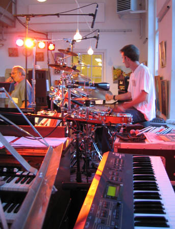Peter Clare from Bristol on drums, seen across a sea of keys