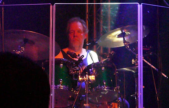 Long-shot of the stage set-up at De Boerderij: the drums are behind Perspex this time