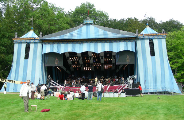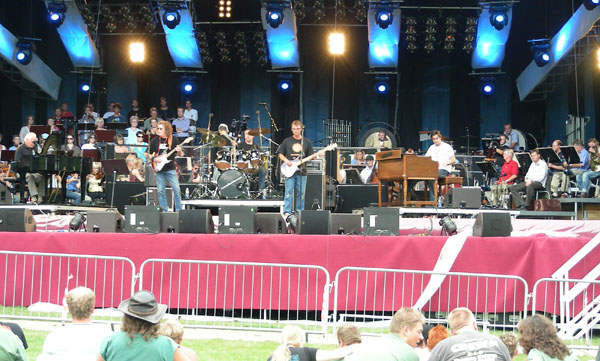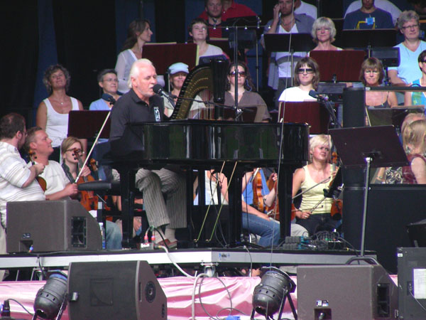 The band on stage: Gary Brooker at the piano, harp behind, strings informally garbed
