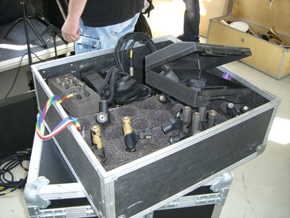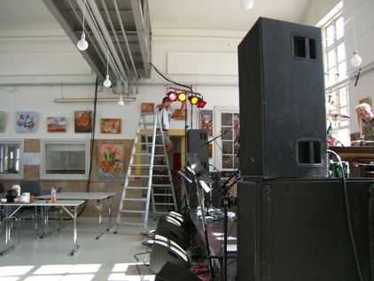Andrè Romke setting up the lights. In the foreground the impressive PA speakers |