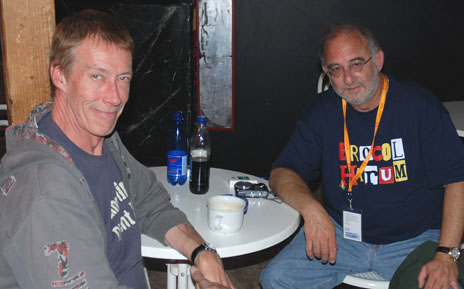 OE's last comments before London: I really believe we are in for a spectacular weekend with the way the band is performing. They are communicating and painting a canvas that is building a picture of what one would expect of the old band – but in 2007. I hope you will be in London or elsewhere soon enough to decide whether you are hearing what I am. Other Palers in attendance seem to agree. (Thanks, One-Eye; picture of Dave and One-Eye thanks to Hans Volkhardt) |