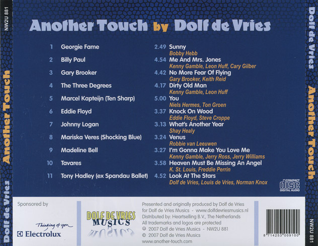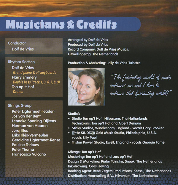 De Vries's liner-note says 'Already at the age of three Dolf de Vries played his first melodies on piano. Still at an early age, with his inborn musical talent and enthusiasm for performing, he was discovered by professionals and learned “the trade”. The freelance pianist of several formations and conductor of many studio/radio/TV orchestras, developed and widened rapidly. Dolf de Vries became much wanted in “The Business”. Today, numerous top artists and orchestras play his arrangements. They ask him to be their pianist/conductor for concerts/performances and to be the producer during their CD/studio recordings.'