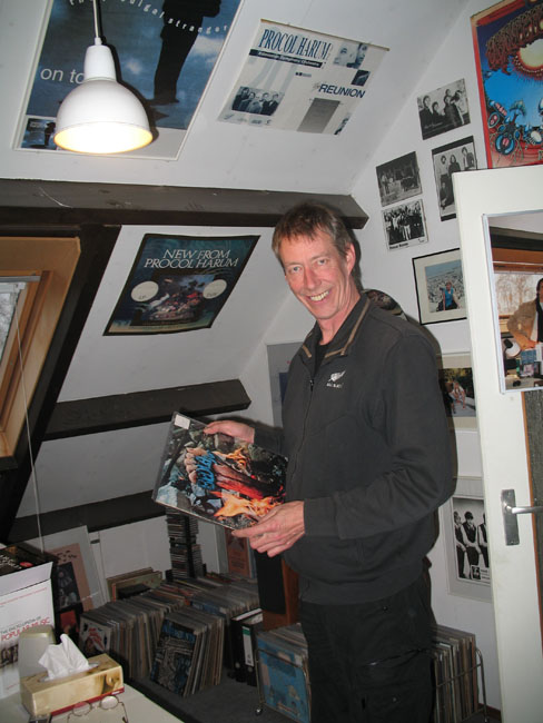 Pale' This includes (probably) all versions of Procol Harum recordings from labels around the world, posters, press cuttings, marketing gizmos and photographs (I even offered to have myself stuffed and put in the corner of the room after I'm gone, but unfortunately the ceiling is quite low and I wouldn't fit). There are files of newspaper cuttings stored from one side of the room to the other, which would take years to wade through. It is quite the most extraordinary complement to a musical group from Southend, and whilst it doesn't have the glitz of a Hard Rock Café wall with imprisoned cast-off guitars signed by hairy shredders from overboiled metal bands, it manages to capture the very essence of understated Procoldom. Frans hasn't stopped at PH players when they are in residence either, as he follows the ex-members of the band through their prior and post incarnations. So I was able to savour some bad reviews from my Bedlam and Long John Baldry days. So thank you Frans for this unusual commitment to Procol and its many members over the years. I'm feeling a little more iconic since my visit – bit like an episode of Doctor Who. On this page are a couple of photographs of me standing in the Museum trying to look like an icon. Ah well ... I tried my best ... Cheers, On the same day Procol historian Frans Steensma wrote to BtP about his photographs: