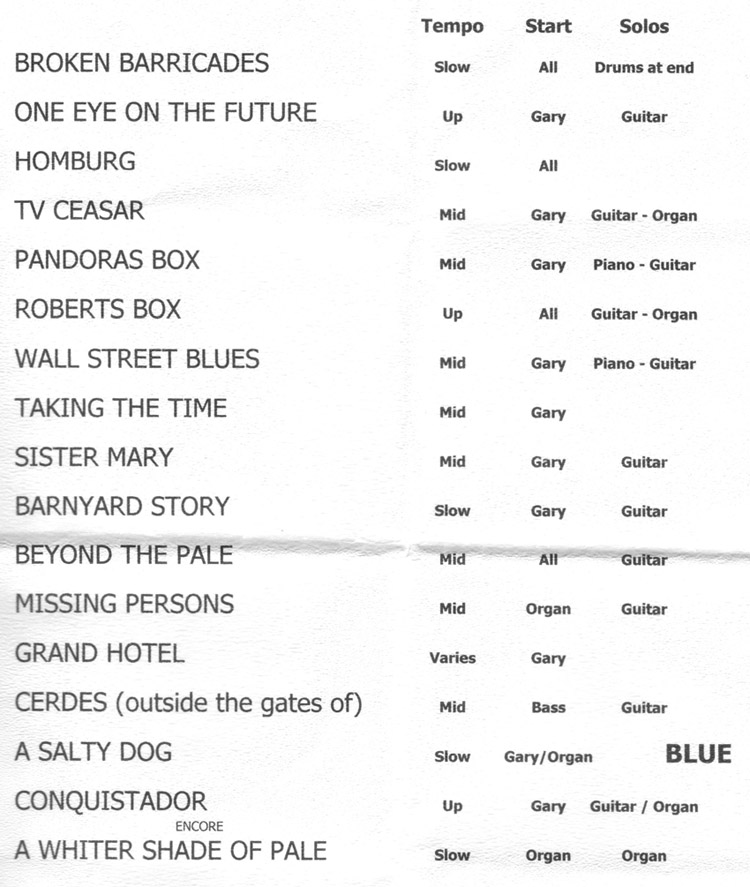 No Conquistador, Grand Hotel, Shine on Brightly ... yet only four albums unrepresented. Gary Brooker's first Procol Harum show since his rib-breaking accident in Finland in the summer. Below, a fascinating document (thanks, Thorsten) gleaned from the lighting desk, showing tempi, and indicating what kind of light is needed and where. Note discrepancies between this and what was actually performed! |