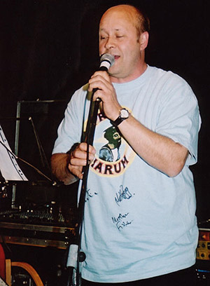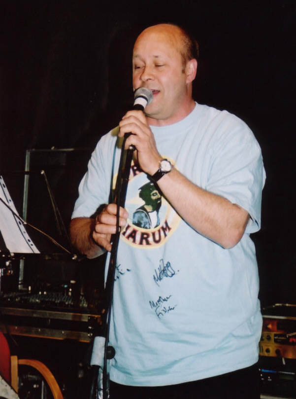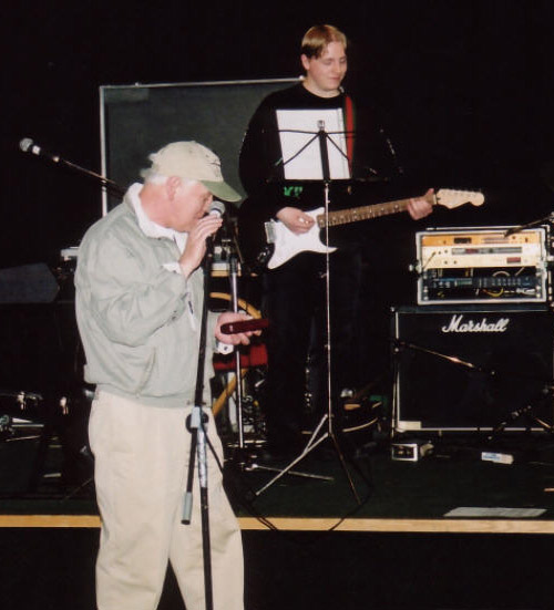 Gary at the microphone, Torjus Ravnaas at the guitar. GB is looking at a spectacle case from which he will shortly draw the winning number in the raffle for a signed Procol Harum tee-shirt |