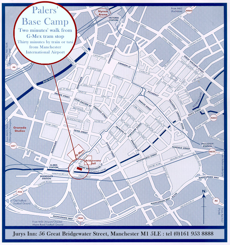 | Manchester has an excellent public transport system including trams and some free 'bus services. If arriving in Manchester Piccadilly by train, travel just three tram stops to 'G-Mex', and Jury's Inn is a short walk away. The Palers' Convention is being held a short train or taxi-ride away. | |