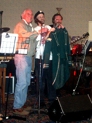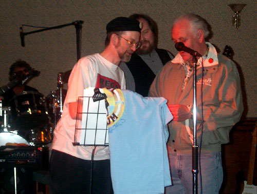 Roland and Gary examine the raffle-trophy, shortly to be won by guitarist Richard Beck, here seen admiring it in the background. |