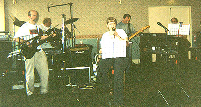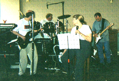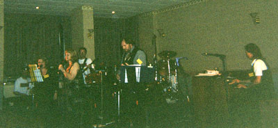 Quite Rightly So in afternoon rehearsal one more time … Roland and Jens on bass and drums, with Nancy on tambourine and Dave in Trower mode |