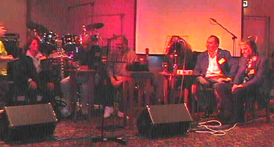 'It started with a quiz …' To the left, the US team … Beverly Peyton, Greg Panfile, Allen Edelist; to the right, the UK team … Sam Cameron, Mark Fendt, Michael Ackermann Almost visible to the left, Gummo, our excellent scorekeeper |