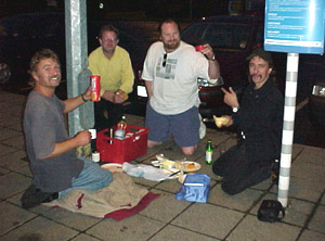 The five players pose a moment before driving up to Manchester, and pause for their evening meal by the motorway |