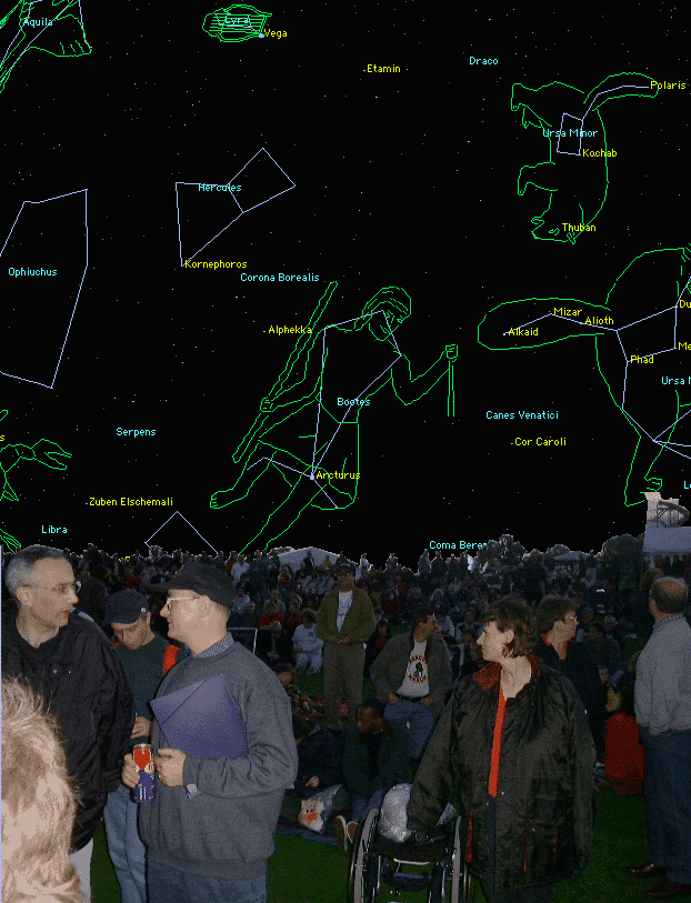I don't know if Douglas Adams was present at Guildford. I hope he caught the opportunity to see Procol a last time. But I know BJ Wilson was there, looking down on the scene. BJ Wilson's star is in the constellation of Ophiuchus, and as you can see in the picture below, it was shining right upon the scene from the far end of the field with spectators. (This picture was made before we knew the exact location of BJ's star, which is actually just a little bit to the left of this picture).