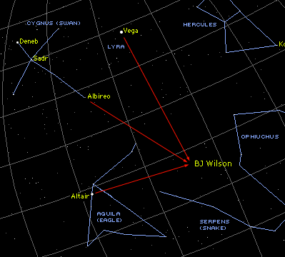 BJ's star is on almost the same "latitude" as Altair. So try to find the point where the line "down" from Vega (ever so slightly tilted to the right) intersects at (almost) right angels with a line from Altair to the right (ever so slightly tilted downwards). At that intersection is the star of BJ Wilson.