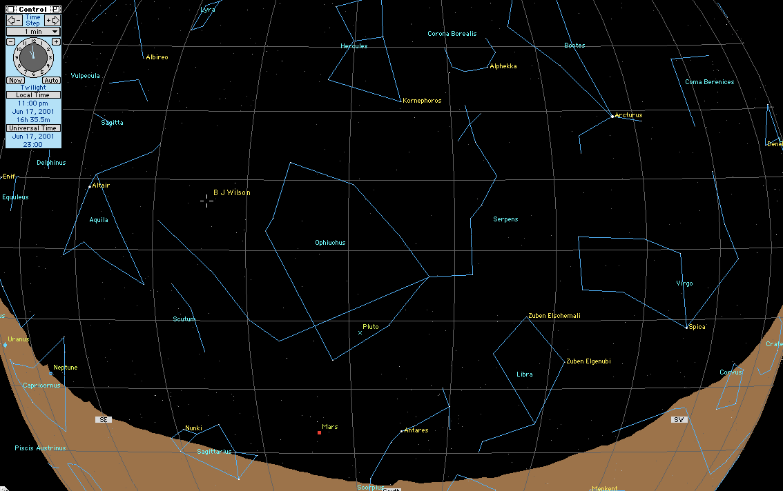 Perhaps not many people know how to find BJ's star, but in the Northern hemisphere, the summer is a good time to give it a try. At this time - mid-June - anywhere you are, Ophiuchus will be exactly to the south precisely at midnight. It will travel westward during the summer, and in mid-August, it will be to the west at midnight. How high it will rise over the horizon, and its angle, will depend on where your are.
