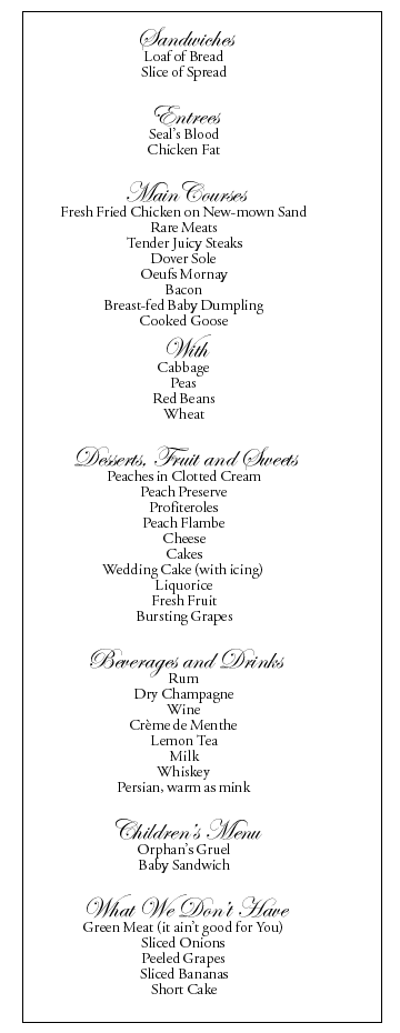But others have recognized the celestial quality in Procol Harum tunes. As many of you know, Douglas Adams got the idea for The restaurant at the end of the universe from the middle part in Grand Hotel - you could imagine this, perhaps, as a menu from such a place. (A restaurant where the cook needs to be replaced, possibly.)