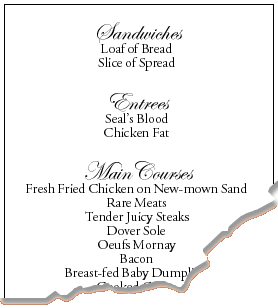 I don't know any rock-poet who has written so much about cooking. As a matter of fact, you could put together a complete menu from his writing; it could look like this, perhaps (click to see the whole menu).