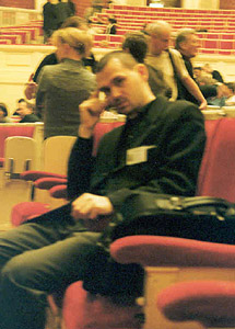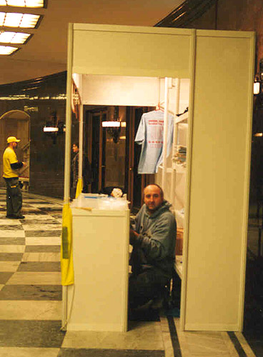 Fans at work on the day: Mirek keeps an eye on things in the auditorium; John Grayson sets up his stall for selling the Shine On merchandise |