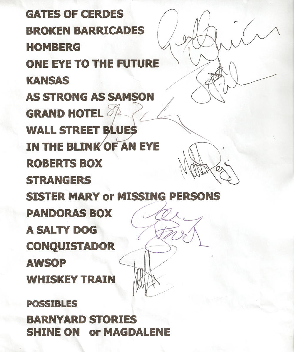 Atlantic City) A Salty Dog (pizzicato string part from the end) and Conquistador (trumpet) on the Motif. Strangers in Space Grand Hotel (GB: 'Tonight we eat fish and chips'; likewise GW on the backup vocals) Fires (Which Burnt Brightly) Whaling Stories (from 'daybreak' to end. Extraordinarily beautiful choir on the Motif) Over the Rainbow (prominent guitar and GB vocal) Aqualung (GW, guitar) just a few chords Blink of an Eye (complete) Pandora's Box ( a few brief seconds) Great Balls of Fire (a few brief seconds)
