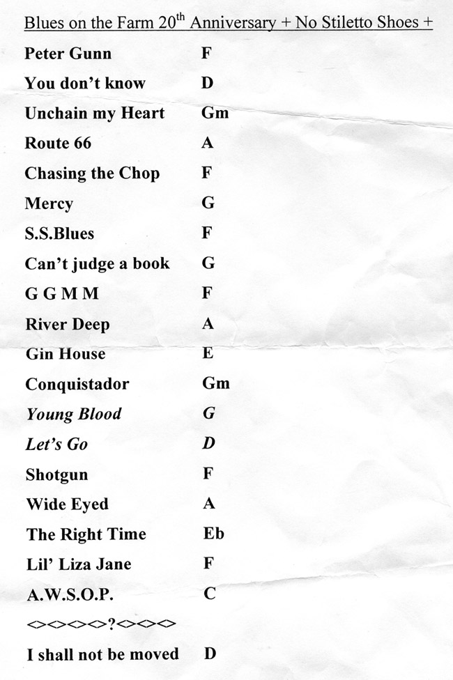 As the setlist below (culled from the stage) indicates, the proposed running-order was modified, partly by omission, partly by re-ordering (though no consecutive songs were in the same key even so). All bands were required to play curtailed sets (Never the Bride can't have played more than five songs) in order that musicians arriving late because of the terrible weather could still be accommodated. With this regime in mind we are lucky to have lost only three Shoes pieces.