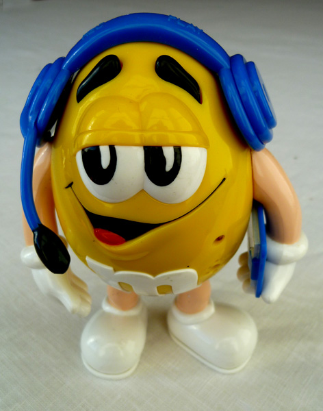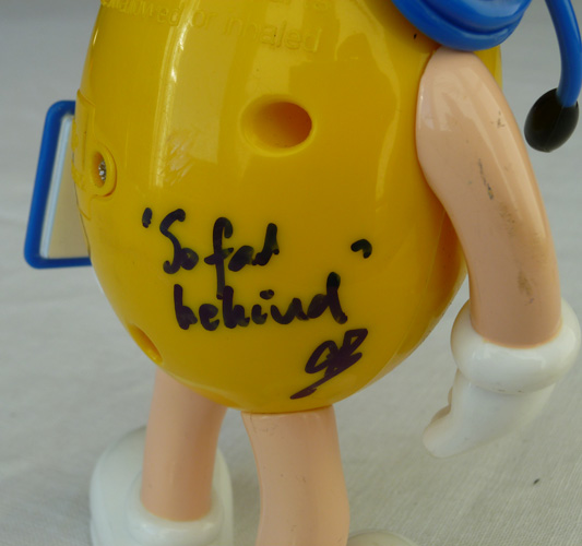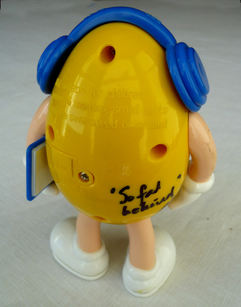So we're starting with this gaudy 'spokescandy' homunculus, whose little electronic voice was heard all over the world chanting 'So far behind' in certain gaps in the song of the same name. The joke trades on the homophonic similarity of 'M&Ms' (a brand of confectionery) and 'Eminem' (the rapping artist).