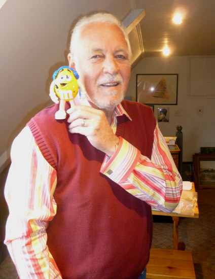 We think his battery has gone flat: only the lucky winner will know if Gary's voice is still inside, when the battery is replaced! He is signed on the behind by The Commander, for authenticity's sake, and is pictured at the foot of the page with Gary – in the control room of the studio in his barn in deepest Surrey, UK.