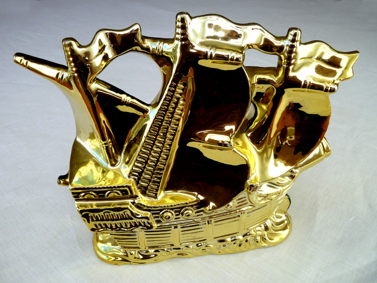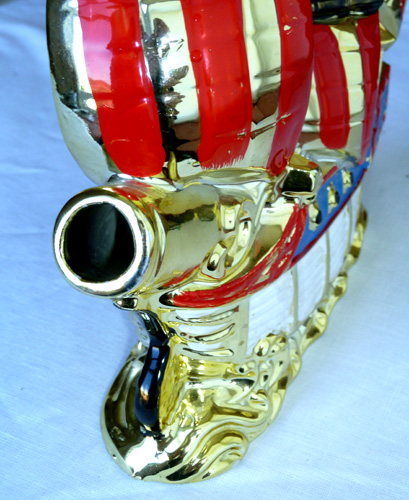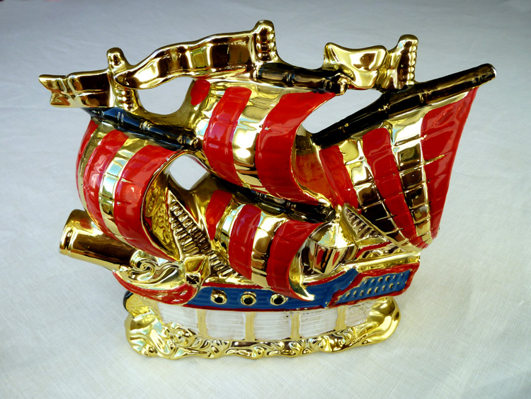 A stately galleon, 8 x 9 x 3 inches, made in ceramic, glazed in gold and painted in red, white and blue