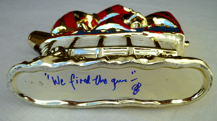 It's not only a suitably-nautical Procol ornament, it's a wine-jug (read more below) and we imagine it will be bought by an elegant host or hostess with a suitably Procoloid sense of humour: imagine the surprise of guests who – once the wine is all poured – notice Gary's writing and initials on the bottom, where he has inscribed the Salty Dog lyric, 'We fired the gun'.
