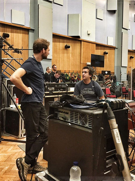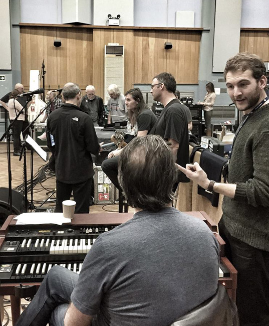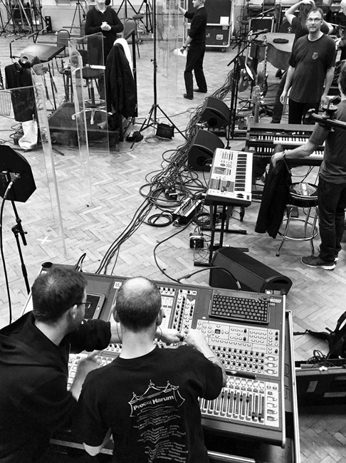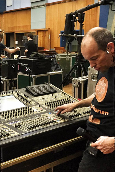 Josh Phillips talks with sound staff; Thomas Wyler presides over the monitor mix