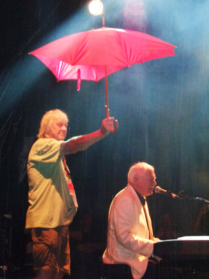 Photo: Gary Brooker plays A Whiter Shade of Pale in torrential rain, sheltered by manager Chris Cooke very much in Prodigal Stranger mode